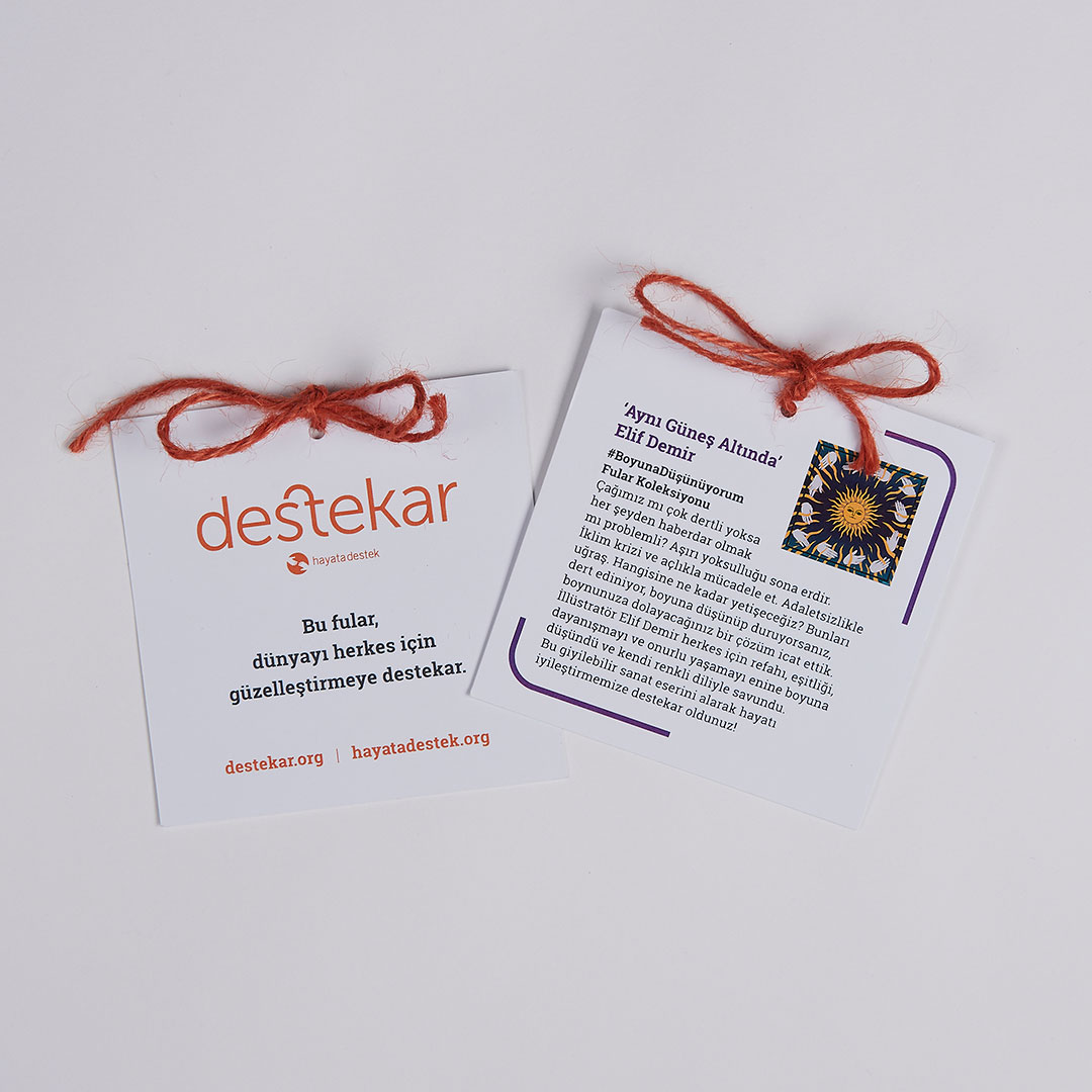 Çağımız mı her zamankinden dertli yoksa her şeyden aynı anda haberdar olmak mı problemli? Aşırı yoksulluğu sona erdir. Açlıkla mücadele et. Eşitsizlik ve adaletsizlikle uğraş. İklim krizine karşı eyleme geç. Hangisine ne kadar yetişilebilir ki? Bunları dert ediniyor, boyuna düşünüp duruyorsanız diye, boynunuza ya sevdiğinizin boyuna dolayacağınız çözümler icat ettik. Yetenekli illüstrasyon sanatçıları Can Çetinkaya, Elif Demir, Ferhan Dayıoğlu, ve Merve Atılgan herkes için refahı, eşitliği, dayanışmayı ve onurlu yaşamayı enine boyuna düşündüler ve kendi renkli dilleriyle savundular, #BoyunaDüşünüyorum Fular Koleksiyonu’nu oluşturdular. Bu giyilebilir sanat eserleri, hayatı herkes için güzelleştirmenize #destekar.